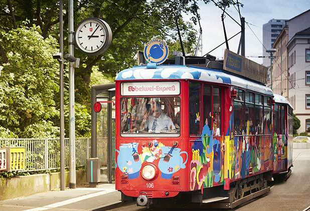 전차에는 밝고 경쾌한 그림이 그려져 있으며 차 안은 연회 분위기로 즐겁습니다. 탑승요금에는 음료와 안주가 포함되어 있으며 어린이도 탑승이 가능합니다. 탑승장소는 여러 곳인데 가장 대표적인 곳은 프랑크푸르트 중앙역과 작센하우젠 정류소입니다.